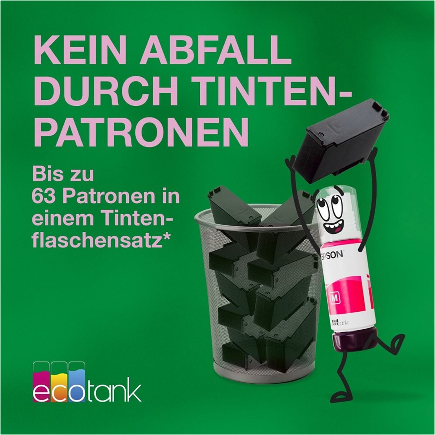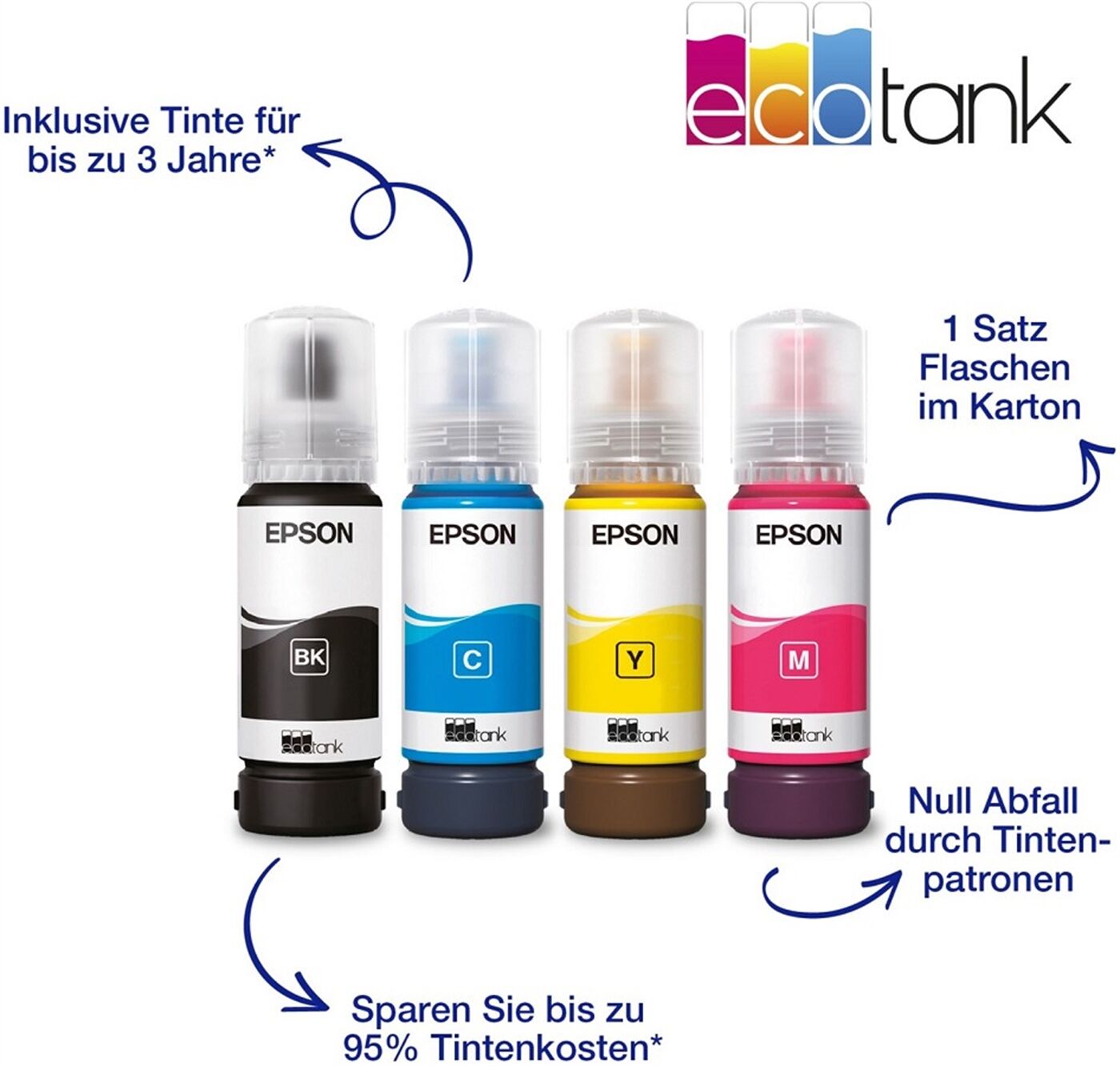 Mit diesem sparsamen Drucker reduzieren Sie Ihre Tintenkosten um bis zu 95 %*. Im Lieferumfang enthalten ist ein Tintenvorrat für bis zu 3 Jahre*. Ein Tintenflaschensatz reicht für den Druck von bis zu 4.500 Seiten in Schwarzweiß und 7.500 Seiten in Farbe*. Das entspricht der beeindruckenden Zahl von bis zu 63 Tintenpatronen!*