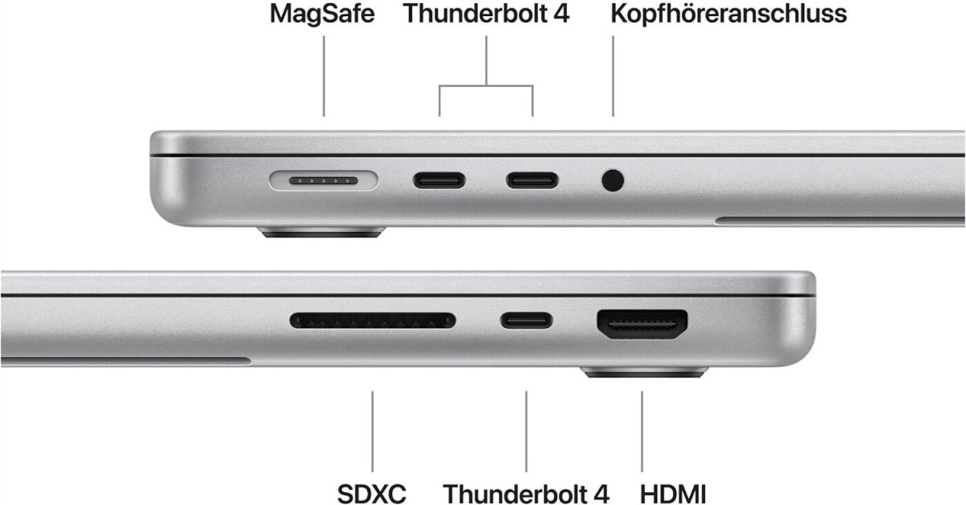 Bitte beachten: Dieser Mac kommt mit einem USB-C auf MagSafe 3 Ladekabel, aber ohne Netzteil. Zum Laden dieses Geräts ist ein 60W USB-C PD kompatibles Netzteil erforderlich. Für optimales Laden empfiehlt Apple, diesen Mac mit dem Apple 70W USB-C Power Adapter oder dem Apple 96W USB-C Power Adapter zu kombinieren, um schnelles Laden zu nutzen.
