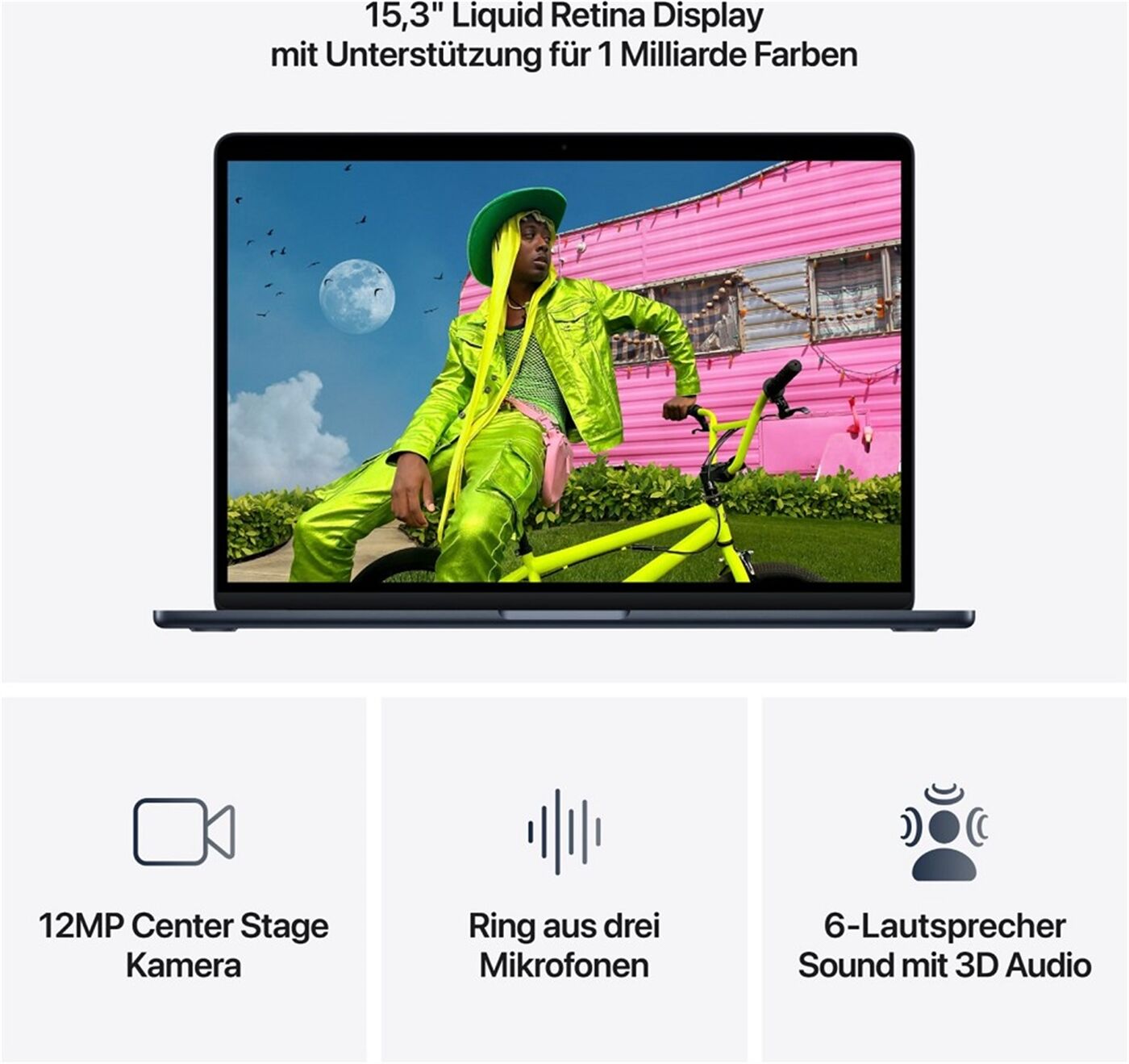 ³ Die Displaygröße wird diagonal gemessen. Das Display des 15" MacBook Air hat oben gerundete Ecken. Als Standard-Rechteck gemessen beträgt die Diagonale des Displays 15,3" (38,91 cm). Der tatsächlich sichtbare Displaybereich ist kleiner.