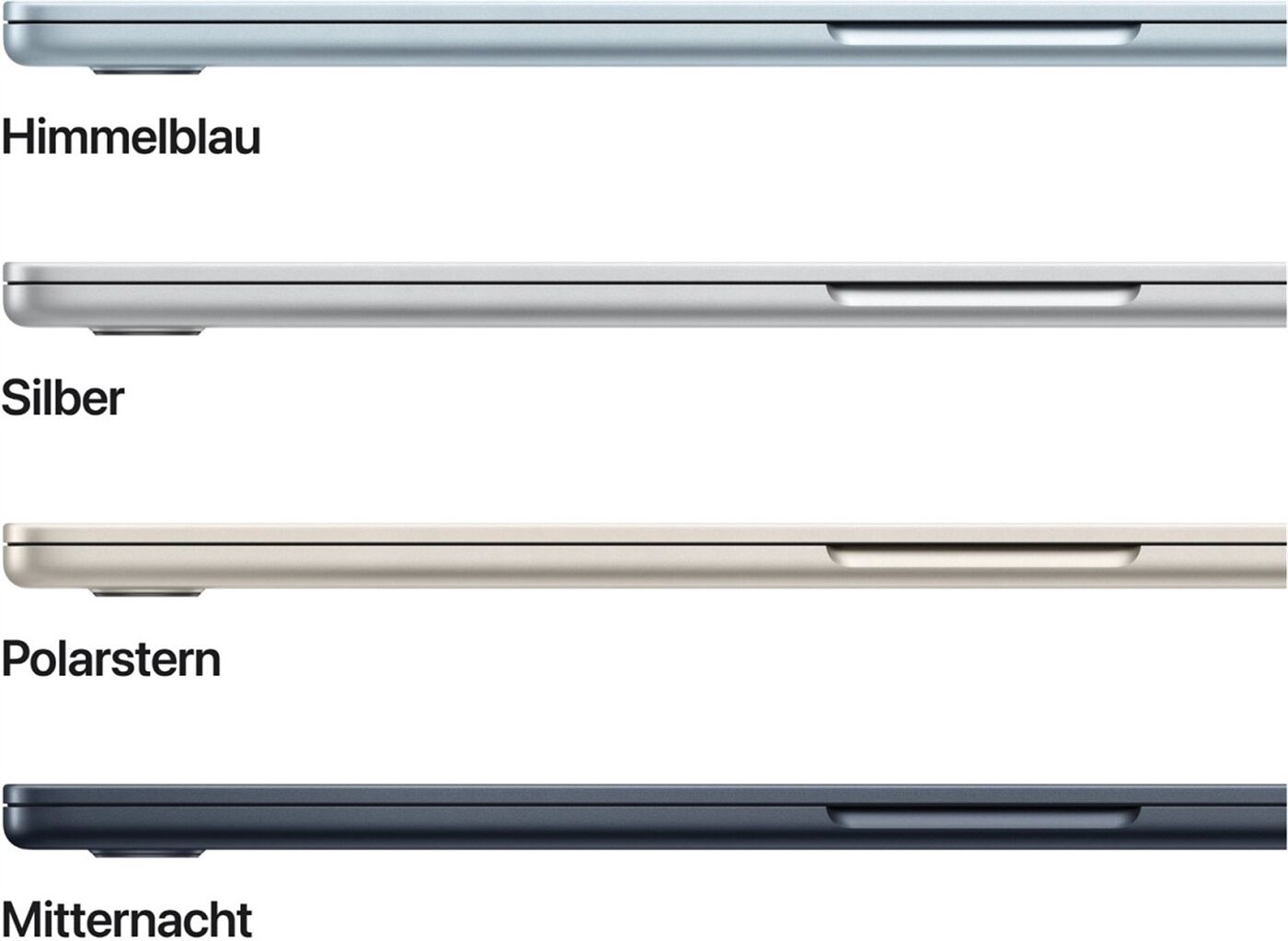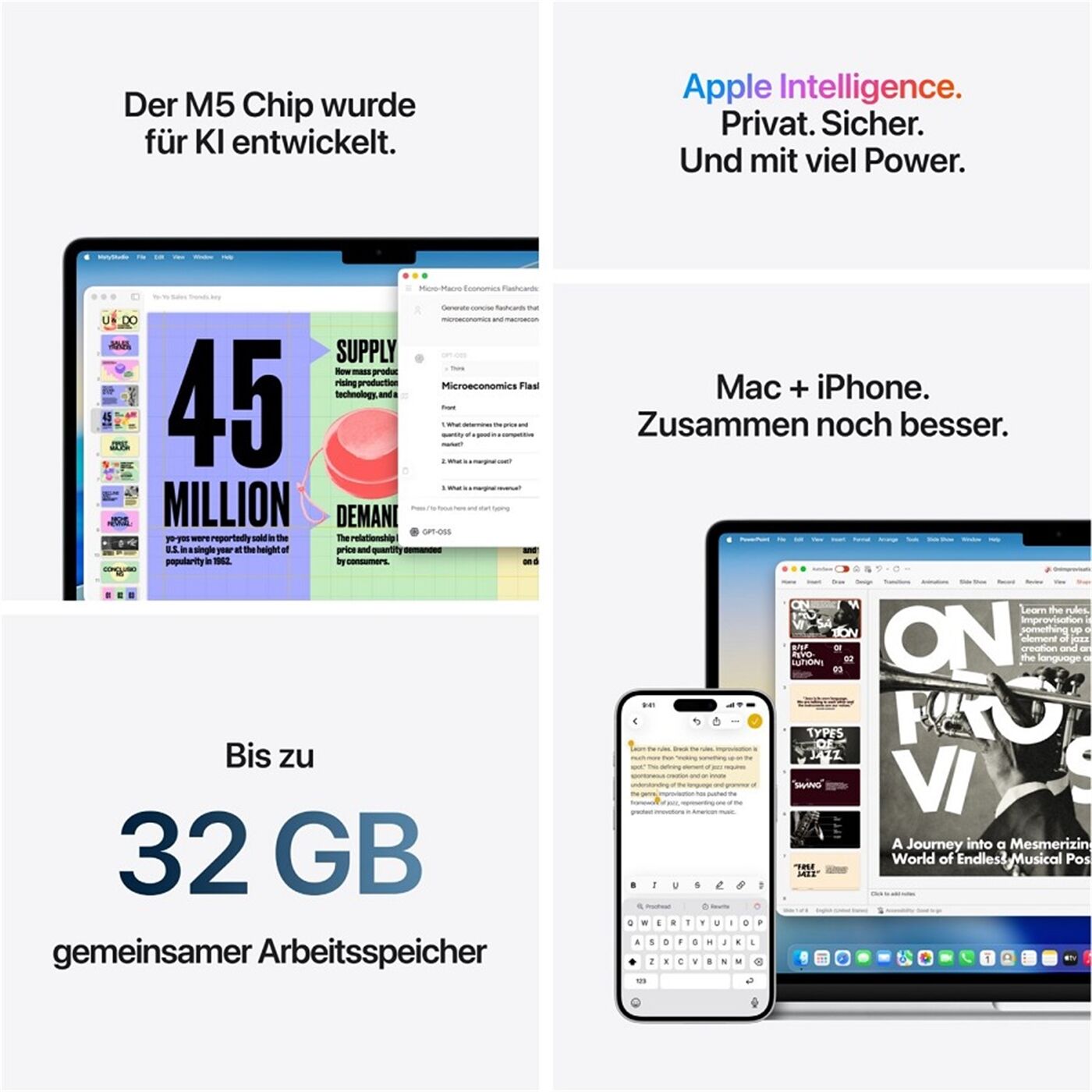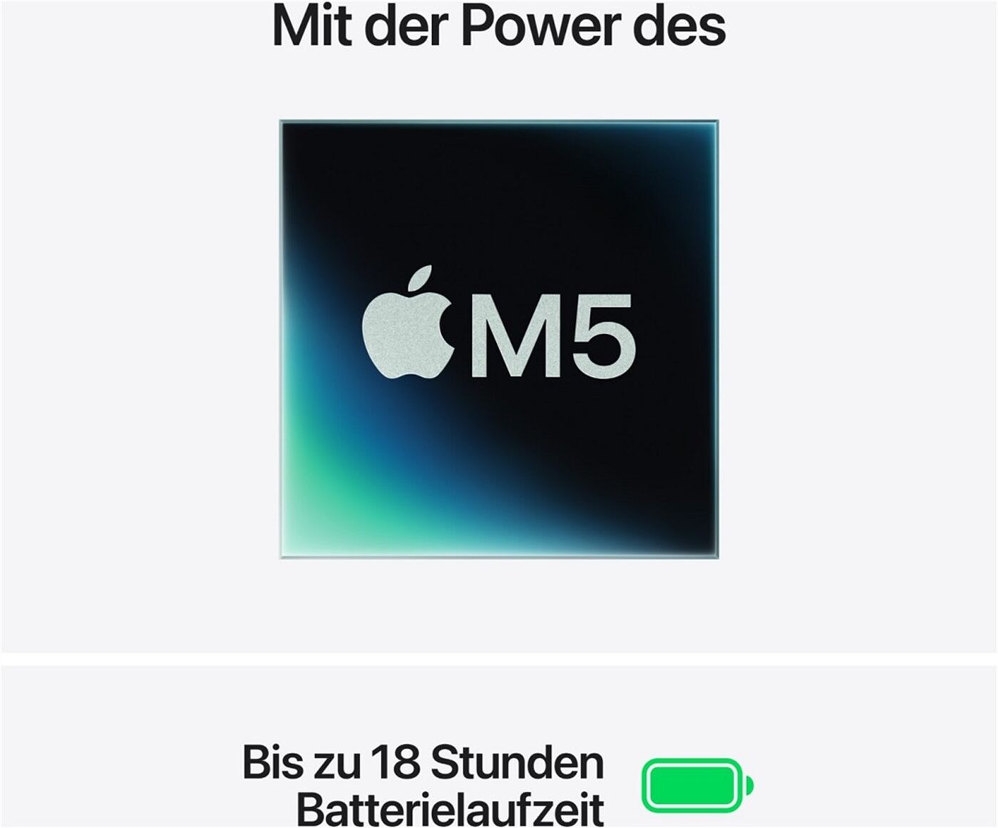² Die Tests wurden von Apple im Januar 2026 durchgeführt mit Prototypen von 13" MacBook Air Systemen mit Apple M5, 10-Core CPU und 8-Core GPU sowie mit Prototypen von 15" MacBook Air Systemen mit Apple M5, 10-Core CPU und 10-Core GPU, alle konfiguriert mit 16 GB RAM und 512 GB SSD. Die Batterielaufzeit für drahtloses Surfen im Web wurde auf 25 gängigen Websites mit einer WLAN Verbindung getestet. Die Batterielaufzeit beim Videostreaming wurde mit 1080p Inhalten in Safari und einer WLAN Verbindung getestet. Alle Systeme wurden mit einer Bildschirmhelligkeit von Stufe 8 und ausgeschalteter Tastatur-Hintergrundbeleuchtung getestet. Die Batterielaufzeit variiert abhängig von Verwendung und Konfiguration. Weitere Infos unter apple.com/de/batteries.