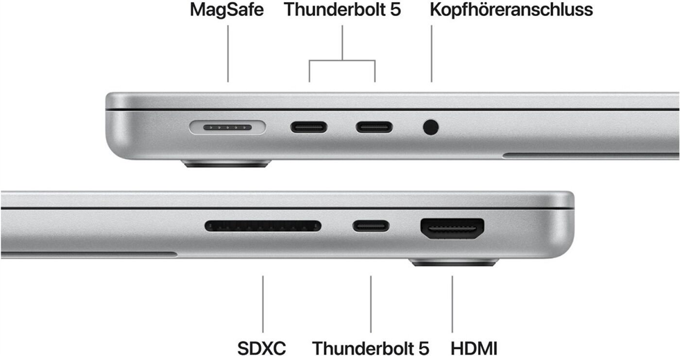 ⁷ WLAN 7 ist verfügbar in Ländern und Regionen, in denen es unterstützt wird.br> ⁸ SCHNELLLADEN: Die Tests wurden von Apple im Januar und Februar 2026 durchgeführt mit Prototypen von 16" MacBook Pro Systemen mit Apple M5 Max, 18-Core CPU, 32-Core GPU, 36 GB gemeinsamem Arbeitsspeicher und 2 TB SSD, mit Prototypen von 16" MacBook Pro Systemen mit Apple M5 Pro, 18-Core CPU, 20-Core GPU, 48 GB gemeinsamem Arbeitsspeicher und 1 TB SSD, mit Prototypen von 14" MacBook Pro Systemen mit Apple M5 Max, 18-Core CPU, 32-Core GPU, 36 GB gemeinsamem Arbeitsspeicher und 2 TB SSD sowie mit Prototypen von 14" MacBook Pro Systemen mit Apple M5 Pro, 18-Core CPU, 20-Core GPU, 24 GB gemeinsamem Arbeitsspeicher und 2 TB SSD. Die 16" MacBook Pro Systeme wurden getestet mit Apple 140W USB-C Power Adaptern (Modell A2452) und die 14" MacBook Pro Systeme wurden getestet mit Apple 96W USB-C Power Adaptern (Modell A2166), jeweils mit USB-C auf MagSafe 3 Kabel (Modell A2363). Die Tests für schnelles Aufladen wurden mit entladenen MacBook Pro Geräten durchgeführt. Die Zeiten wurden gemessen ab dem Einschalten aus dem Ruhemodus oder ab dem Erscheinen des Apple Logos beim Start des Geräts. Die Ladedauer variiert abhängig von Einstellungen und Umgebungsbedingungen. Die tatsächlichen Ergebnisse können variieren.