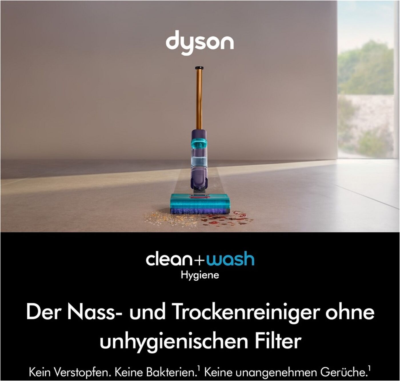 Entfernt sowohl trockene als auch nasse Verschmutzungen, ohne die Verwendung eines unhygienischen Filters. Keine Bakterien oder unangenehm riechende Ausblasluft.¹