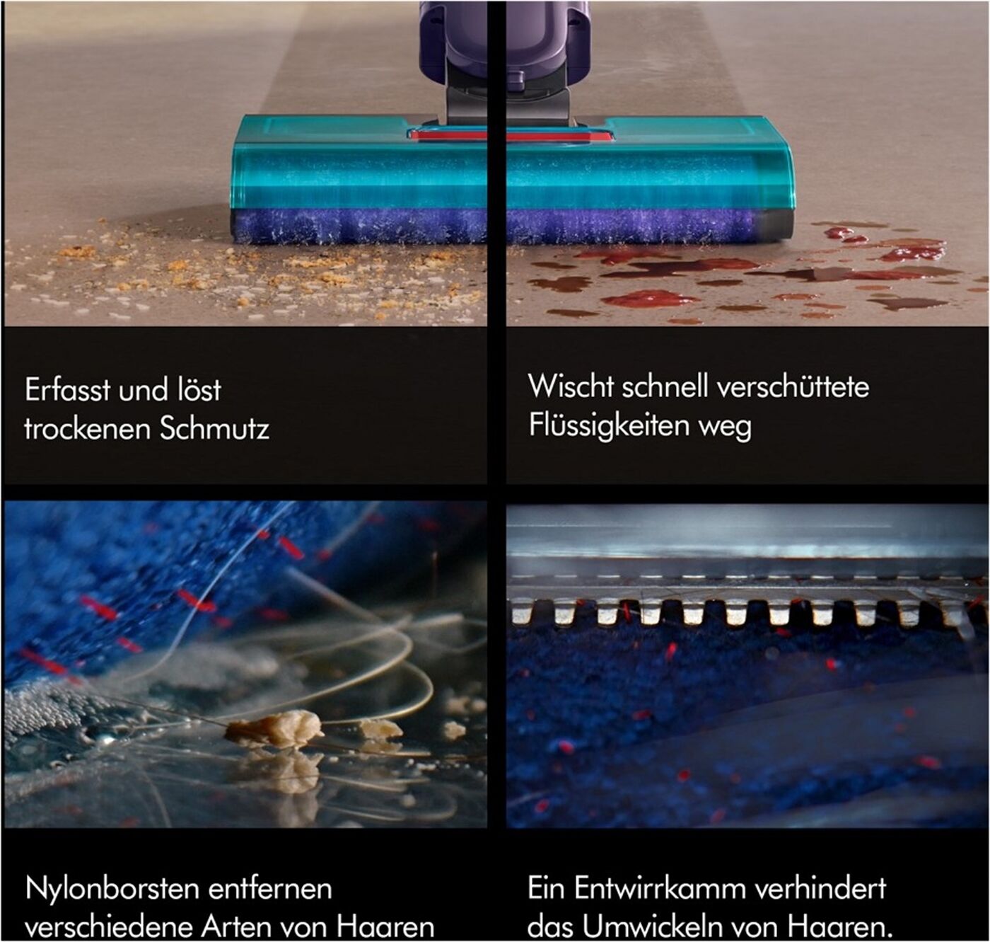 Mit Nylonborsten versehen, löst die Mikrofaserwalze alle Arten von Haaren, auch Tierhaare, von der Bodenoberfläche – selbst wenn sie nass sind. Der Entwirrkamm hinter der Walze verhindert, dass sich die Haare in ihr verheddern oder verfangen – bis zu einer Länge von 35 cm.