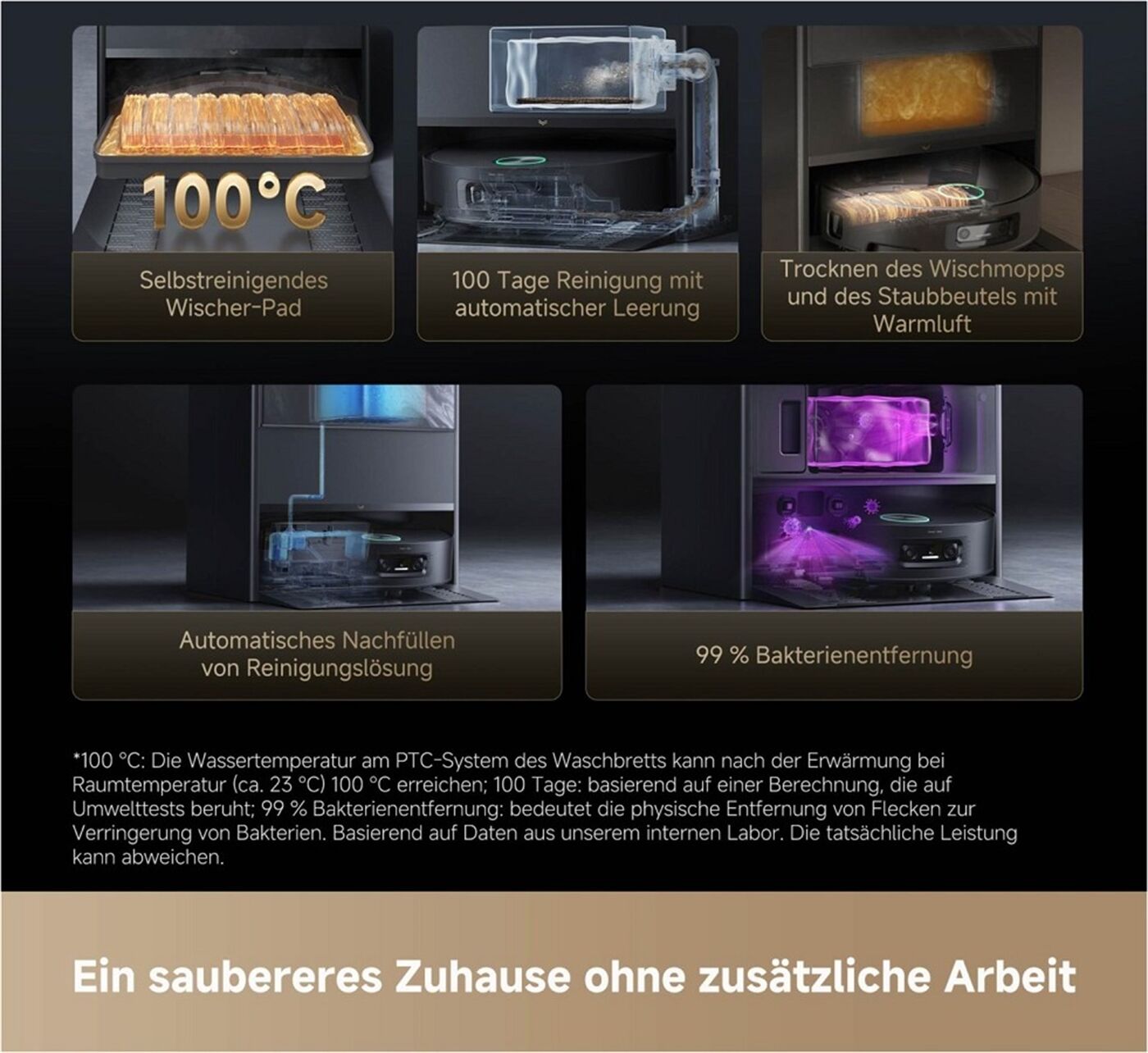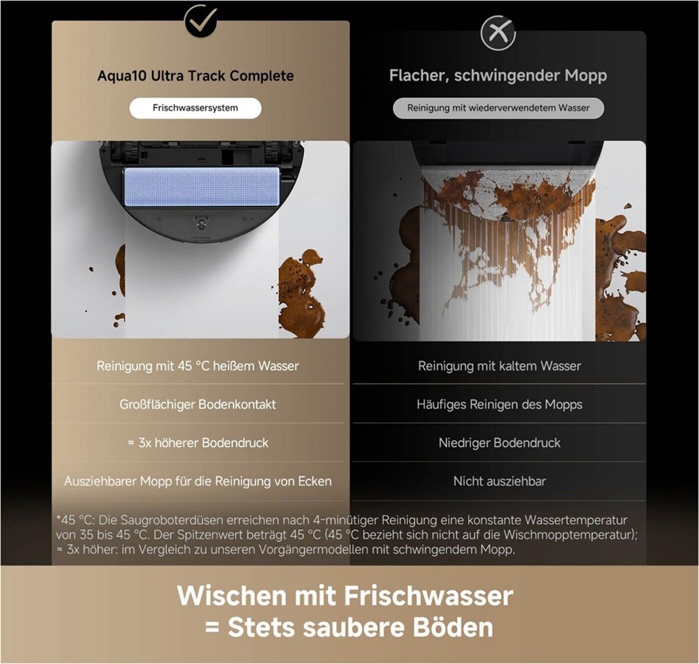 Effektive Wischfunktion mit 45°C Warmwasser: Das Wasser wird auf 45°C erhitzt und direkt auf den Mopp gesprüht, um selbst hartnäckige Schmutz- und Fettflecken effektiv zu lösen. Die getrennten Frisch- und Schmutzwasserbehälter im Roboter garantieren eine gründliche, rückstandsfreie Reinigung.
