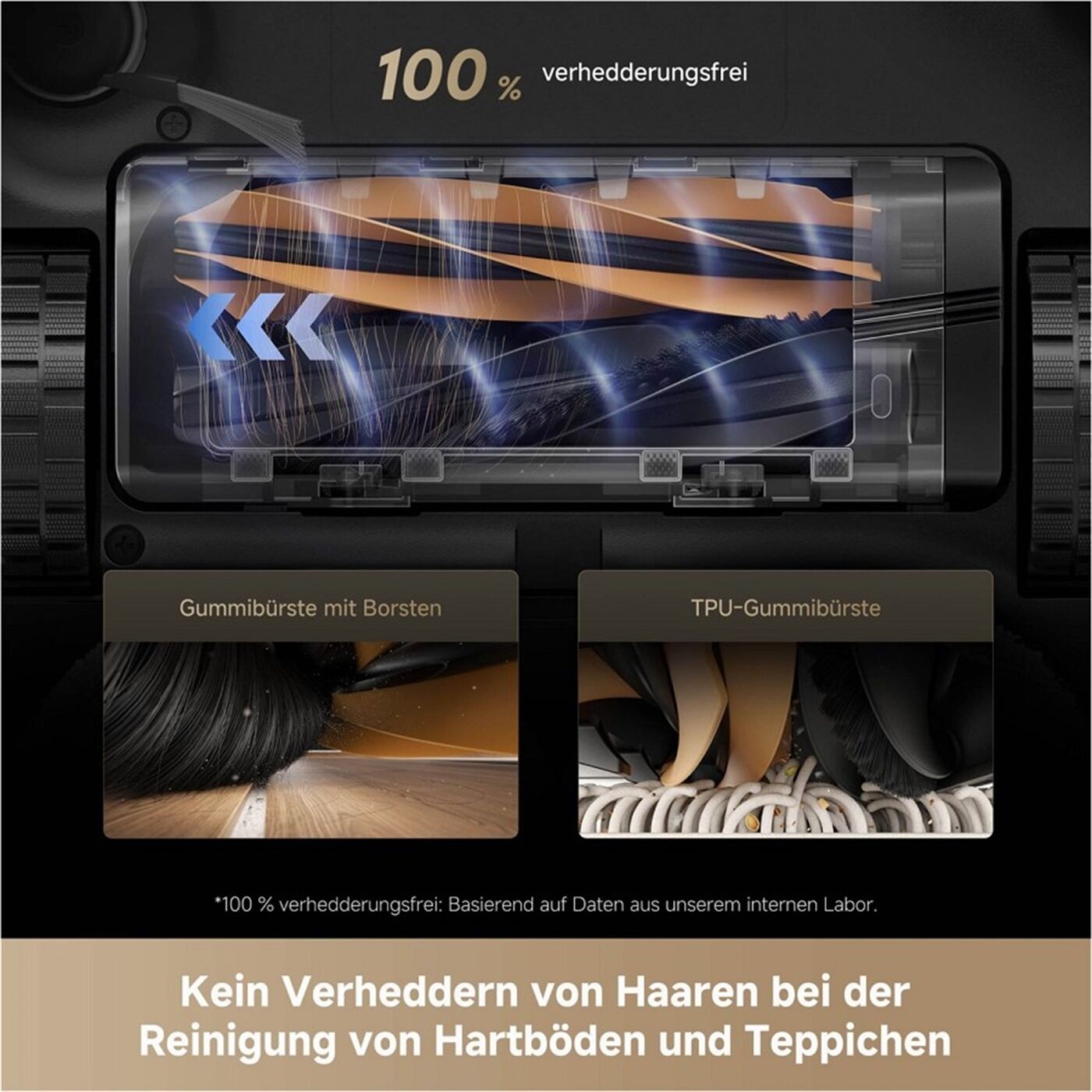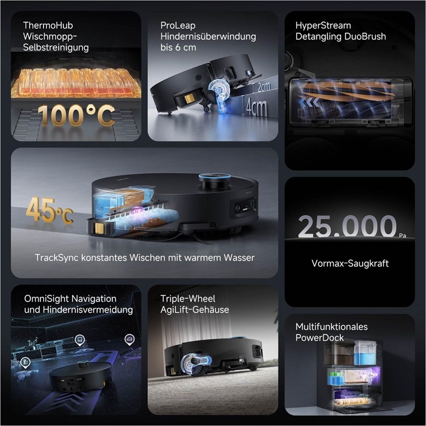 Starke Saugleistung: Mit einer beeindruckenden Saugleistung von 25.000 Pa entfernt der Roboter selbst tiefsitzenden Staub, Krümel und Tierhaare zuverlässig. Die innovative HyperStream™ Detangling DuoBrush verhindert, dass sich Haare in der Bürste verheddern – perfekt geeignet für Haustierbesitzer.