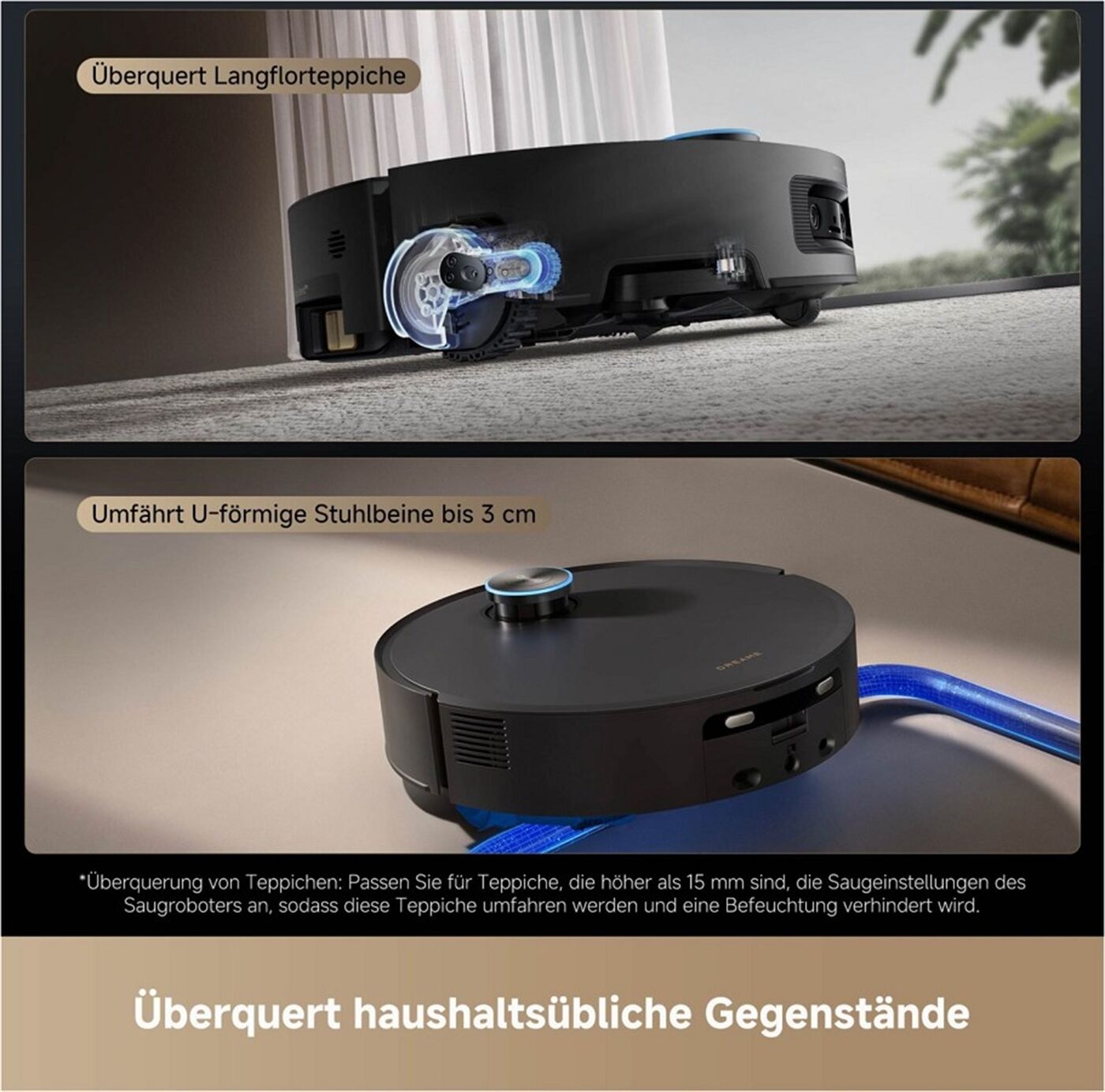 Intelligente Navigation mit KI-gestützter Objekterkennung: Zwei integrierte Kameras ermöglichen die Erkennung von bis zu 240 Objektarten. Der Roboter weicht Kabeln, Spielzeug oder Haustieren sicher aus und plant effiziente Reinigungsrouten. Auch Hindernisse bis 6 cm Höhe, wie Teppiche oder Türschwellen, überwindet er mühelos.