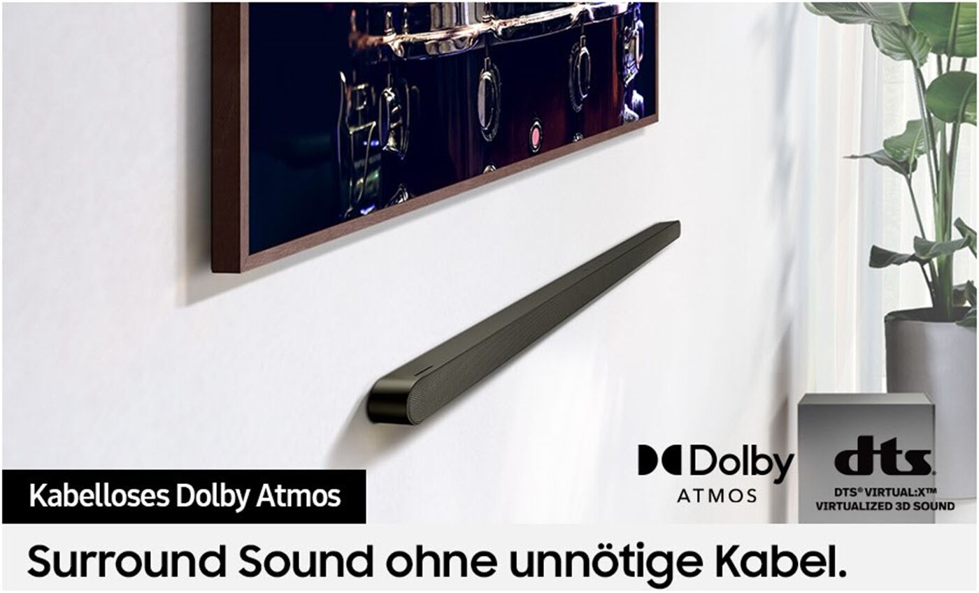 Samsung Soundbars unterstützen die objektbasierte Audiotechnologie Dolby Atmos® kabellos, d. h., ohne dass ein Kabel oder zusätzlicher Dongle angeschlossen werden muss. Erlebe somit beeindruckenden Surround Sound von Filmen und Musik ganz einfach über dein WLAN und freu dich über den aufgeräumten Look in deinem Heimkino.